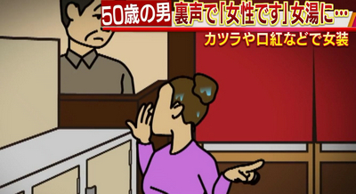 据日本媒体报道,寺本康博在10日晚上9点左右,来到位于札幌市白石区的一处浴汤,当时他化着妆带着假发混入了其中的女汤。由于这位大叔身高1.7米,体型较胖,加上一直姿势十分扭捏地遮住下体,所以遭到一名女常客怀疑。这名女常客立刻向澡堂工作人员反映了情况,澡堂方面也随即联系警方前来现场调查。